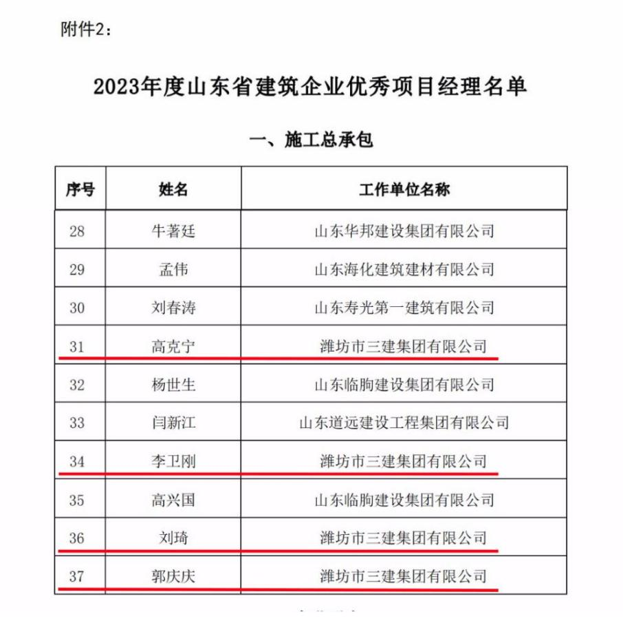 近日,山東省建設(shè)工會、山東省建筑業(yè)協(xié)會下發(fā)《關(guān)于公布2023年度山東省建筑業(yè)企業(yè)優(yōu)秀項(xiàng)目經(jīng)理勞動競賽獲獎名單的通知》,集團(tuán)公司高克寧、李衛(wèi)剛、劉琦、郭慶慶四人通過單位申報、競賽工作委員會評議審定和綜合評審,被授予“山東省建筑業(yè)企業(yè)優(yōu)秀項(xiàng)目經(jīng)理”稱號。